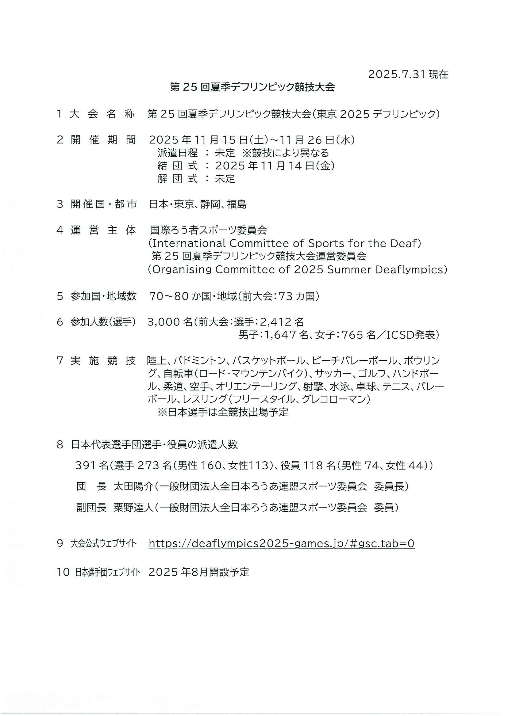 第25回夏季デフリンピック競技大会 静岡県関係 20250731現在